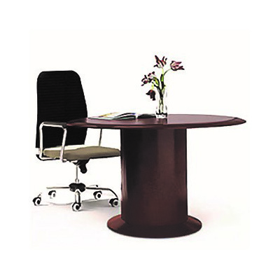 Mesa redonda para sala de juntas, Cubierta mdf, polipropileno, triplay barnizado, triplay con laminado plástico, melanina de 19 mm de espesor con cubre cantos termo fusionados en color negro.