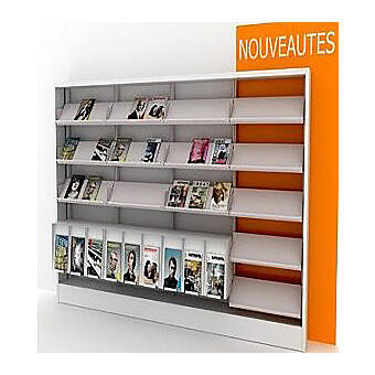 Sistema modular formado por una batería de cuatro revisteros sencillos con un apartado para números consecutivos. Revistero sencillo metálico Fabricado en paneles mdf, polipropileno de 28 y 19 mm laminado plástico y entrepaños inclinados y un entrepaño cubre polvo en lámina calibre 20 con porta títulos, base y cremalleras calibre 14 perfil abierto con regatones niveladores de altura terminadas en pintura epóxica micro pulverizada, aplicada electrostáticamente, horneada a más de 200°C previo tratamiento de fosfatizado y lavado por aspersión con soldadura de micro alambré con argón calibre 35.